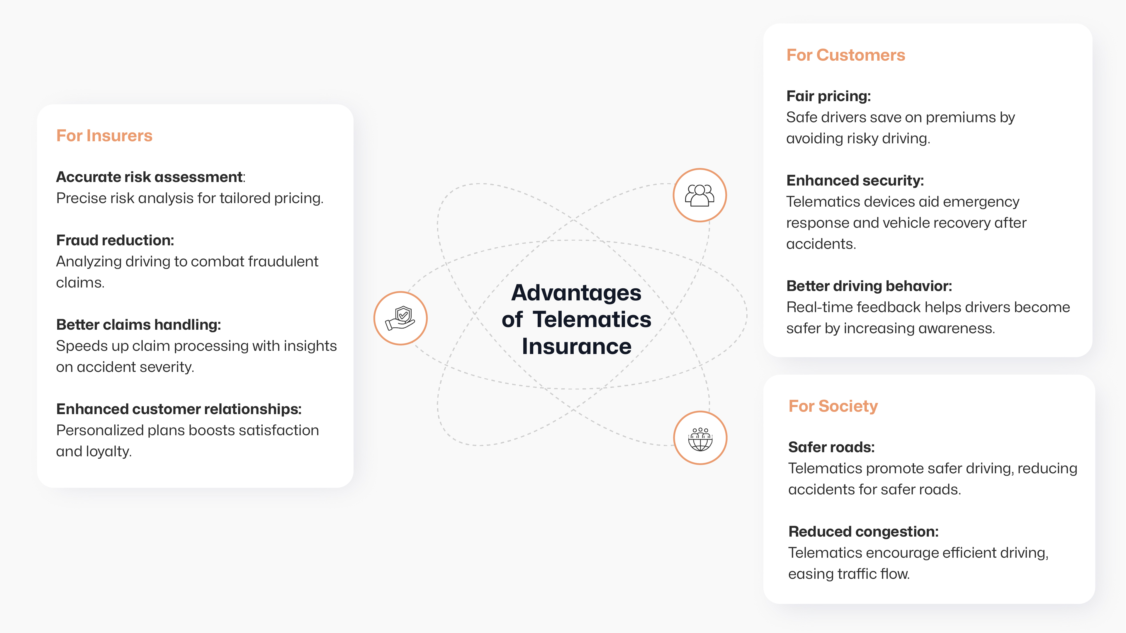 Customers enjoy several benefits from telematics. Safe driving habits are rewarded with lower premiums, promoting safer roads. Telematics devices also enhance security by acting as trackers during accidents, facilitating emergency response and recovery of the stolen vehicle. It also provides real-time feedback on driving habits which helps drivers modify their behavior and adopt safer habits.